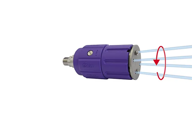 Rotordüsen, auch als Rotationsdüsen bekannt, vereinen Punktstrahlen mit hoher Aufprallkraft und Flachstrahlen mit hoher Flächenleistung. Sie entfernen hartnäckige Verschmutzungen von großen Flächen, wie Fassaden oder Steinböden und bearbeiten feste Materialien wie Beton. Diese Technik ermöglicht eine variable Drehzahl, was sanfte Reinigung für große Flächen oder kraftvolle Entfernung von Rückständen ermöglicht. Die Wahl aktiver oder inaktiver Düsen optimiert die Reinigung.